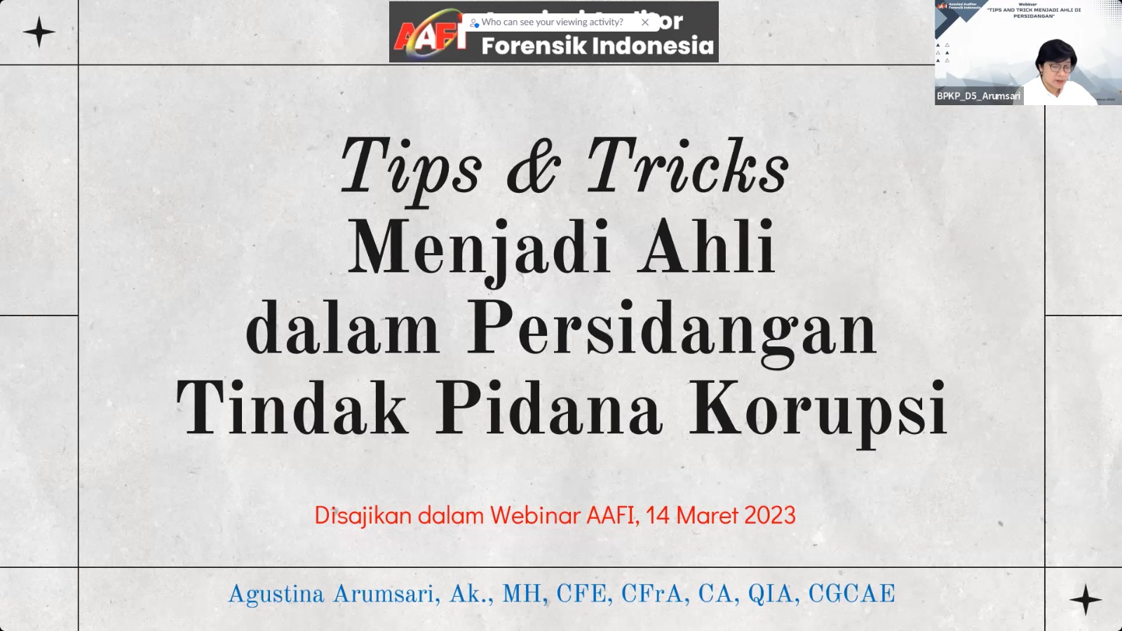 Terkait hal itu, AAFI WANDOAK menggelar webinar bertajuk Tips and Tricks Menjadi Ahli di Persidangan yang menghadirkan Ibu Agustina Arumsari, Ak., M.H., CFE, CFrA, CA, QIA, CGCAE (Deputi Investigasi BPKP) sebagai Narasumber dan Ibu Dr. Selvia Vivi Devianti S.E., M.Sc., MCP., Ak, CFrA, CFE, CSFA (Direktur Litbang BPK RI) selaku Moderator.�